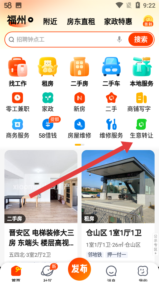 1、打開58同城進(jìn)入首頁后點(diǎn)擊生意轉(zhuǎn)讓圖標(biāo),位于功能欄第三行最右側(cè),進(jìn)入商鋪轉(zhuǎn)讓信息的頁面。