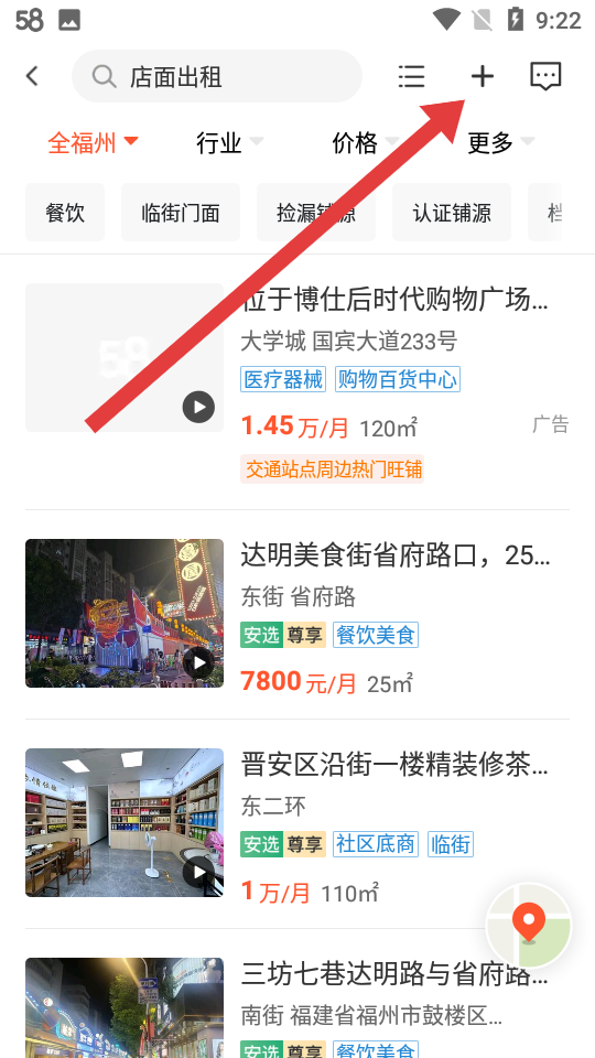 2、在商鋪轉(zhuǎn)讓的頁面,我們需要點(diǎn)擊右上角+號(hào)按鈕,進(jìn)入商鋪信息發(fā)布分類的選擇界面。