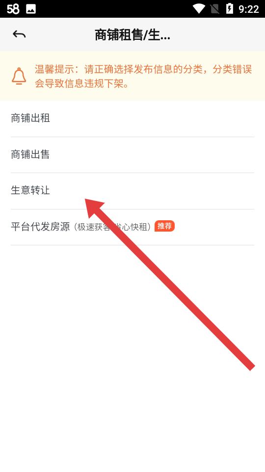 3、在分類列表中,點(diǎn)擊生意轉(zhuǎn)讓選項(xiàng),進(jìn)入信息填寫頁面,后續(xù)依次填寫信息,等待審核通過即可發(fā)布廣告。