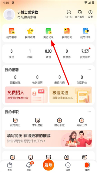 2、在個(gè)人頁面中,找到并點(diǎn)擊瀏覽記錄選項(xiàng)。
