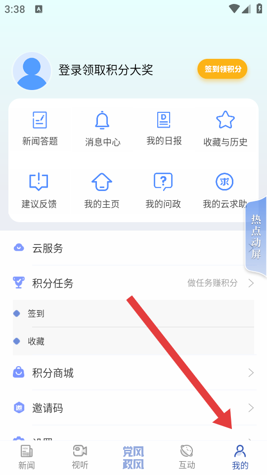 2、打開(kāi)極光新聞底部導(dǎo)航欄最右側(cè)的我的圖標(biāo),進(jìn)入個(gè)人中心頁(yè)面,點(diǎn)擊頂部登錄可以開(kāi)啟登錄流程。