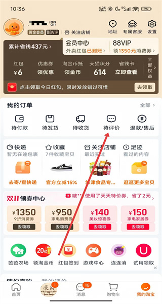 2、在登錄后可點擊我的按鈕進入我的主頁,在我的主頁中點擊待評價選項,進入評價管理界面。
