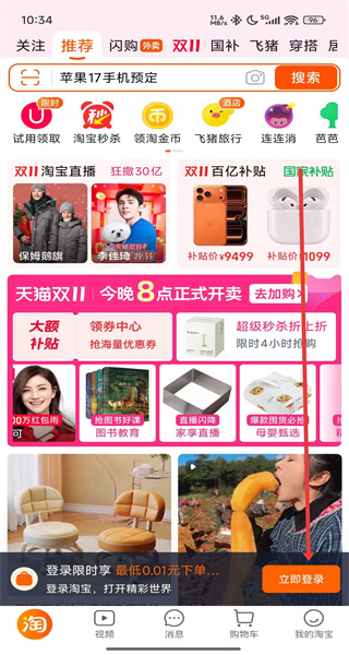 1、打開淘寶APP,點擊首頁右下角立即登錄按鈕,完成淘寶賬號登錄。
