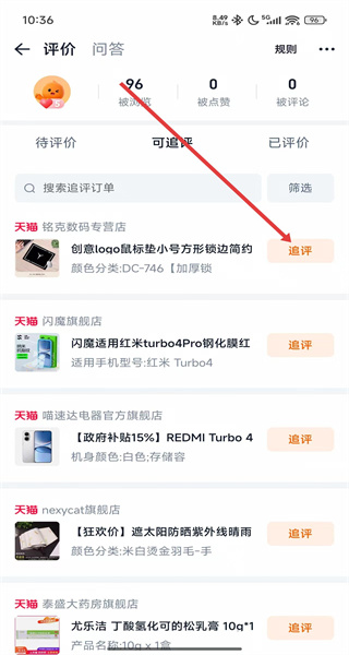 3、在評價管理界面的可追評列表中,找到喜歡的商品,點擊右側(cè)追評按鈕進行追評操作。