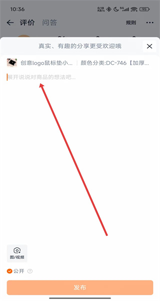 4、可以在彈出的輸入框內(nèi),輸入對該商品的使用感受、想法等內(nèi)容后,點擊發(fā)布按鈕即可完成追評。