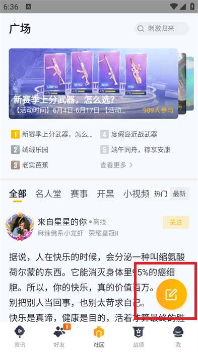2、在社區(qū)頻道,點(diǎn)擊其中的【書簽】圖標(biāo),就可以進(jìn)入到發(fā)布動(dòng)態(tài)的界面;