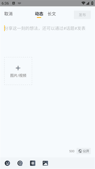 3、在動(dòng)態(tài)發(fā)布界面,就可以看到文案的輸入頁(yè)面,還有圖片和視頻內(nèi)容都可以添加,然后我們就可以輸入想要發(fā)布的動(dòng)態(tài);