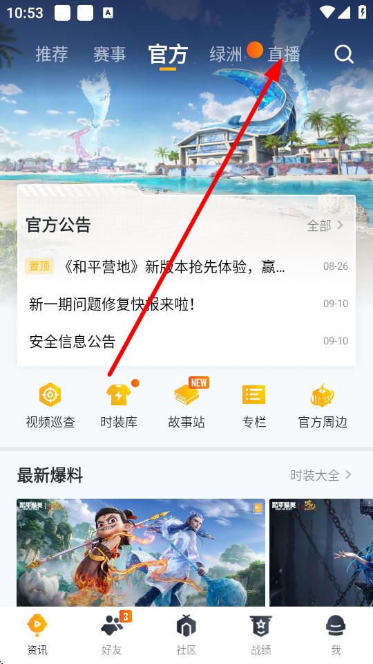 1、打開和平營(yíng)地APP,點(diǎn)擊上方導(dǎo)航欄中的直播選項(xiàng)進(jìn)入直播頁(yè)面。