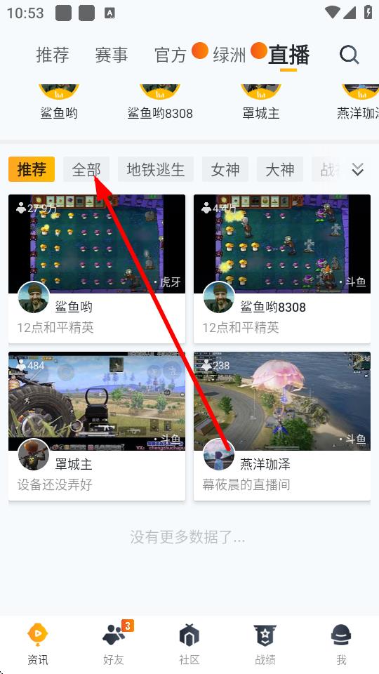 2、在直播頁(yè)面中,點(diǎn)擊全部標(biāo)簽,瀏覽各個(gè)直播間。