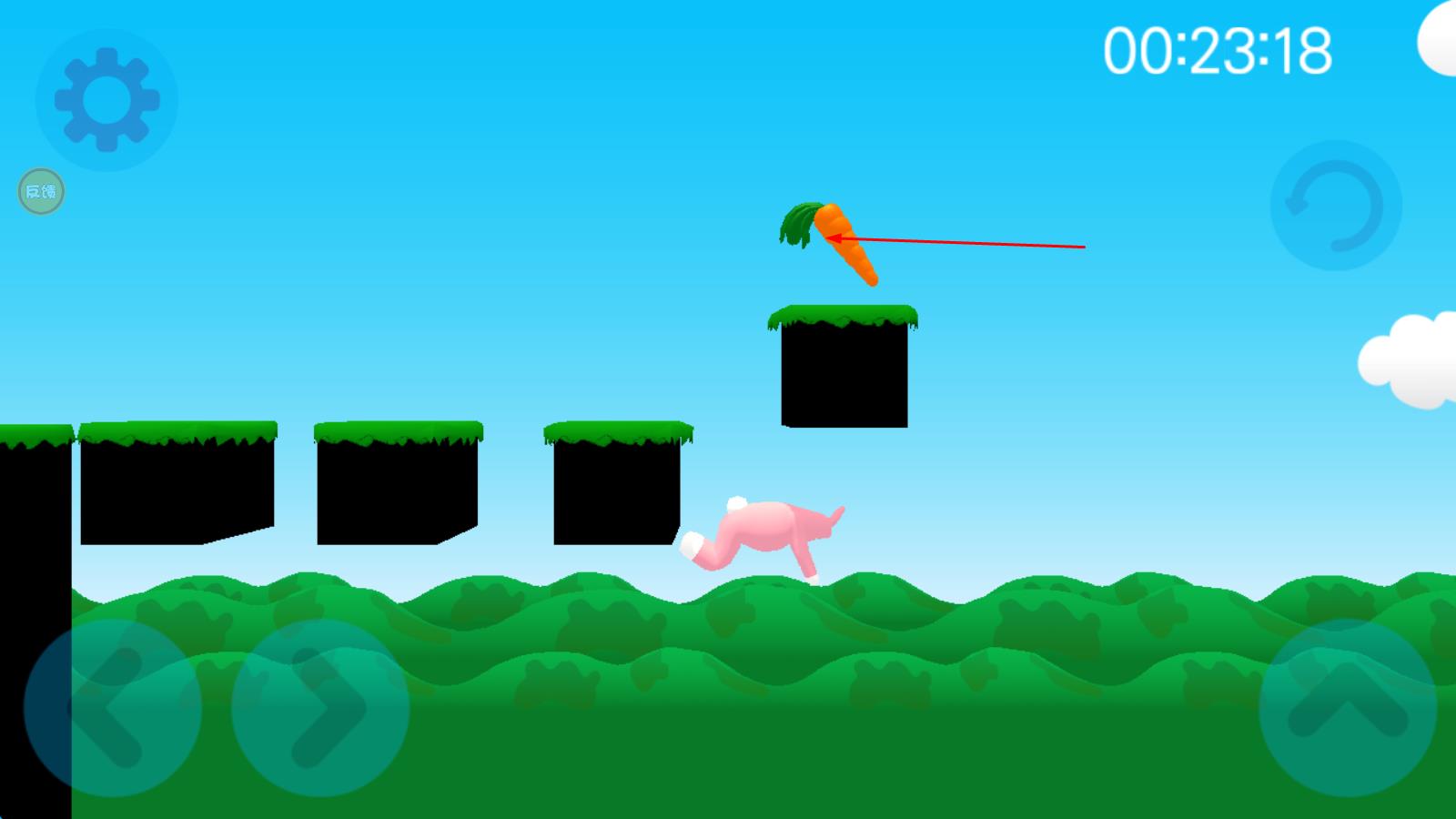 2、游戲中途,面對懸崖、地刺等復雜陷阱,需精準把控觸屏力度與時機,讓兔子人靈活躲避;同時留意胡蘿卜位置,拾取后可提升噴射次數(shù),助力后續(xù)闖關。