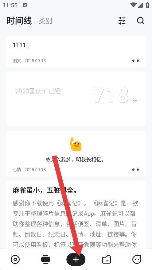 1、打開麻雀記APP,進(jìn)入主界面,點(diǎn)擊底部導(dǎo)航欄中間的+號(hào)按鈕。