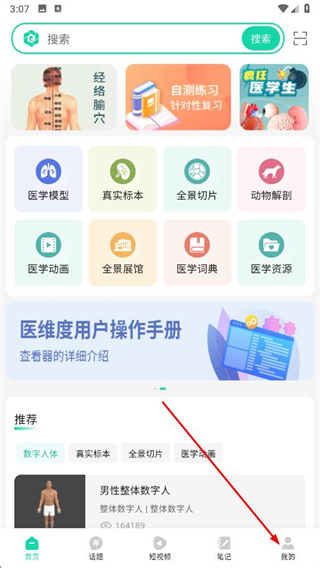 1、打開醫(yī)維度解剖app,進(jìn)入首頁,點(diǎn)擊底部導(dǎo)航欄中的我的選項(xiàng)。