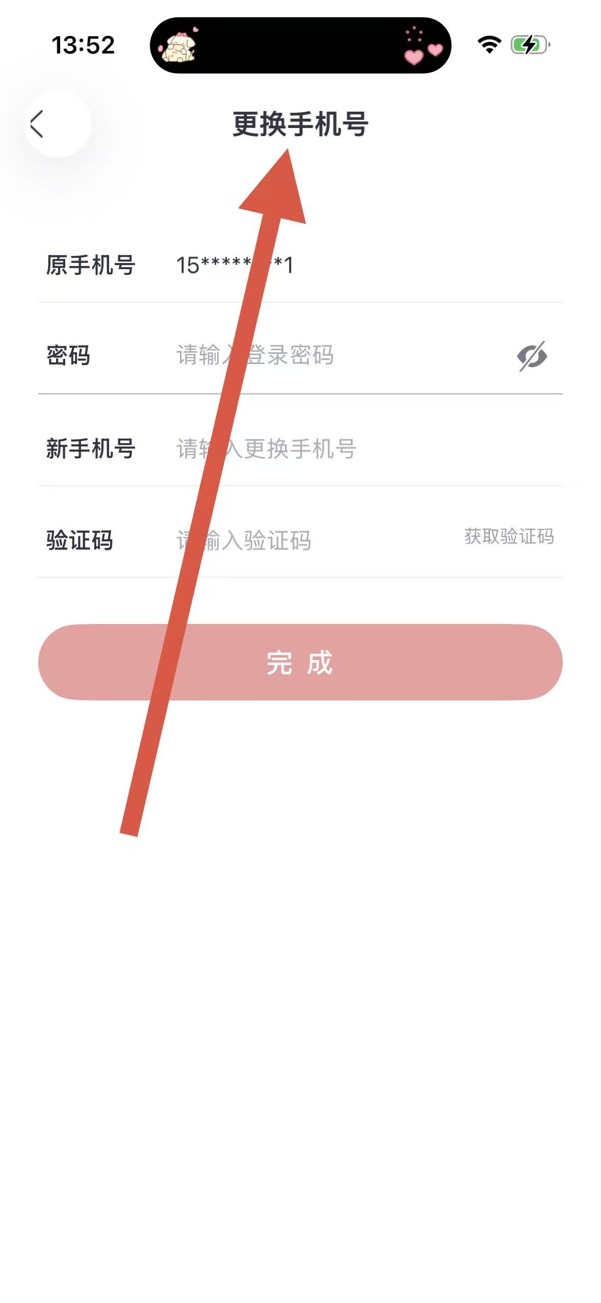 4、在更換手機號頁面,輸入原手機號、密碼、新手機號以及獲取的驗證碼,然后點擊完成,即可完成手機號更換操作。