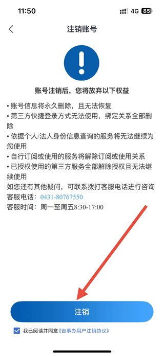 4、在注銷賬號頁面勾選同意用戶注銷協(xié)議,點擊注銷按鈕,按提示完成后續(xù)操作。