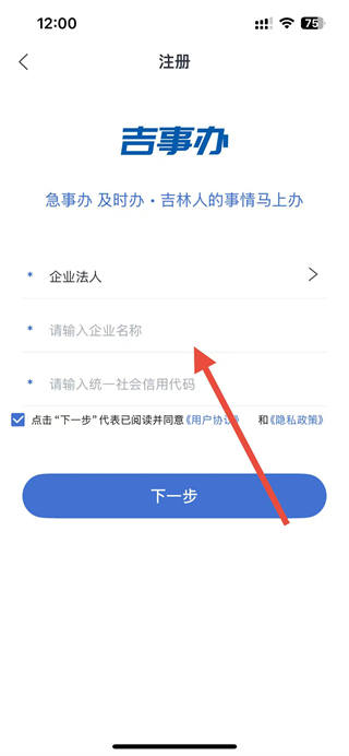 4、在注冊頁面依次填寫信息,勾選協(xié)議后,點擊下一步,完成法人賬號注冊流程。