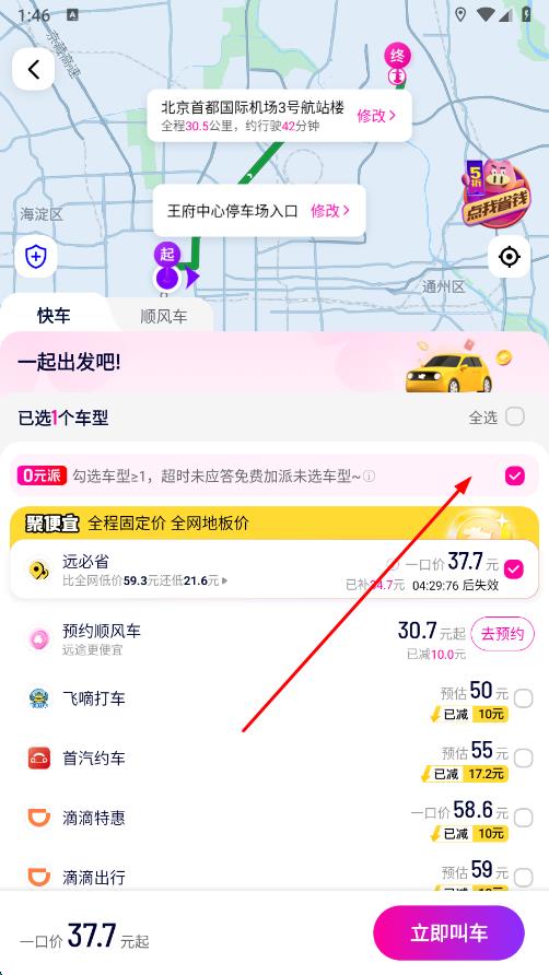2、輸入目的地后,進(jìn)入選擇車型界面,平臺提供的不同車型選項,比如飛嘀打車、首汽約車、陽光出行等。