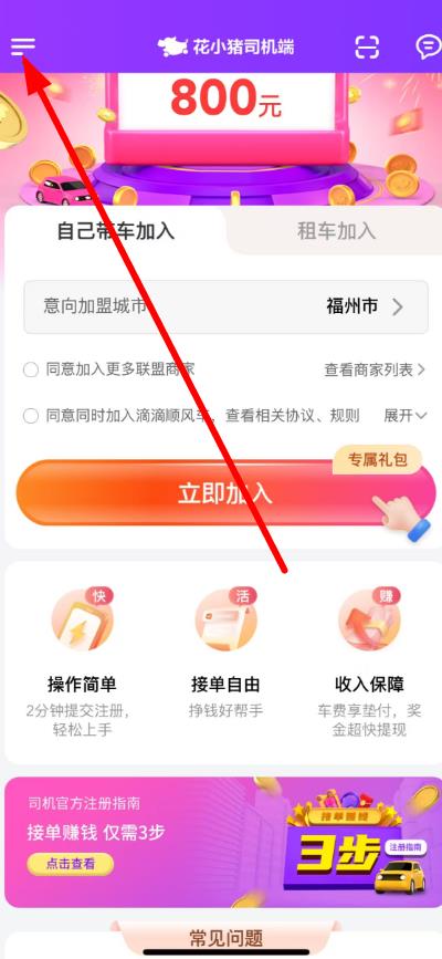 1、打開(kāi)花小豬司機(jī)端應(yīng)用,點(diǎn)擊界面左上角三條橫線(xiàn)圖標(biāo),展開(kāi)隱藏菜單。