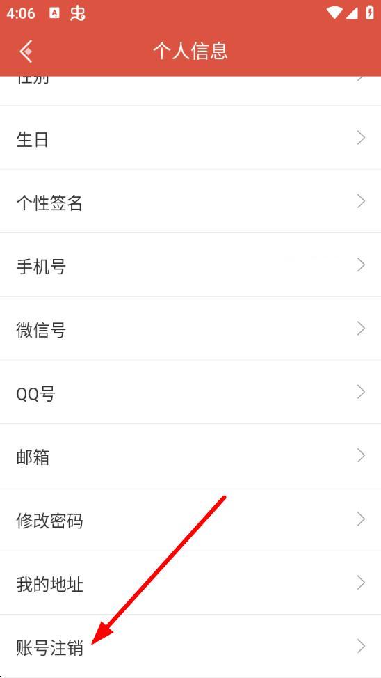 2、在個(gè)人信息頁(yè)面,向下滑動(dòng)找到賬號(hào)注銷(xiāo)選項(xiàng),點(diǎn)擊進(jìn)入賬號(hào)注銷(xiāo)申請(qǐng)頁(yè)面。