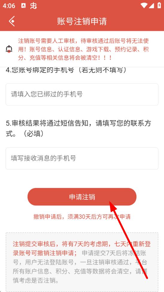 3、在賬號(hào)注銷(xiāo)申請(qǐng)頁(yè)面,按要求填寫(xiě)完成后點(diǎn)擊申請(qǐng)注銷(xiāo)按鈕。注銷(xiāo)提交審核后有7天考慮期,7天后賬號(hào)將凍結(jié)無(wú)法登錄,審核通過(guò)后賬號(hào)相關(guān)信息將被清空。