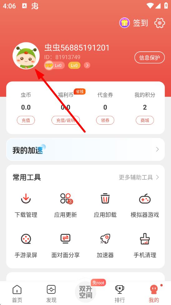 1、打開(kāi)蟲(chóng)蟲(chóng)助手應(yīng)用,點(diǎn)擊底部導(dǎo)航欄中的我的,進(jìn)入個(gè)人頁(yè)面,點(diǎn)擊左上角頭像區(qū)域。