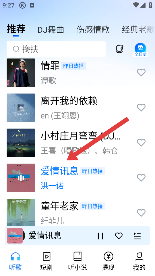 1、打開酷狗音樂APP,在聽歌的頁面,點(diǎn)擊想要播放的歌曲如示例中的愛情訊息。