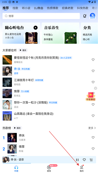 1、啟動酷狗的APP,進(jìn)入首頁點(diǎn)擊導(dǎo)航欄中我的。