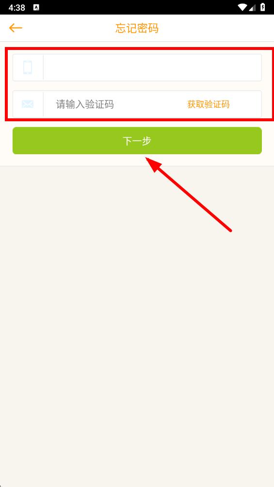4、在忘記密碼頁面,輸入手機號并點擊獲取驗證碼,收到驗證碼后填入,接著點擊下一步。