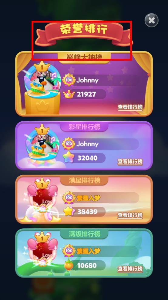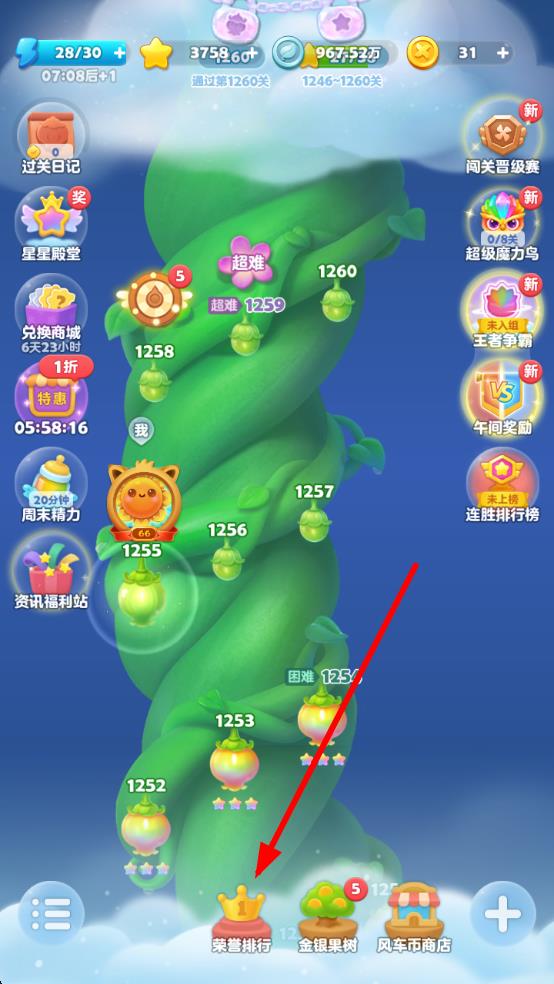 1、打開開心消消樂游戲,在主界面點(diǎn)擊下方的榮譽(yù)排行按鈕,進(jìn)入榮譽(yù)排行界面。