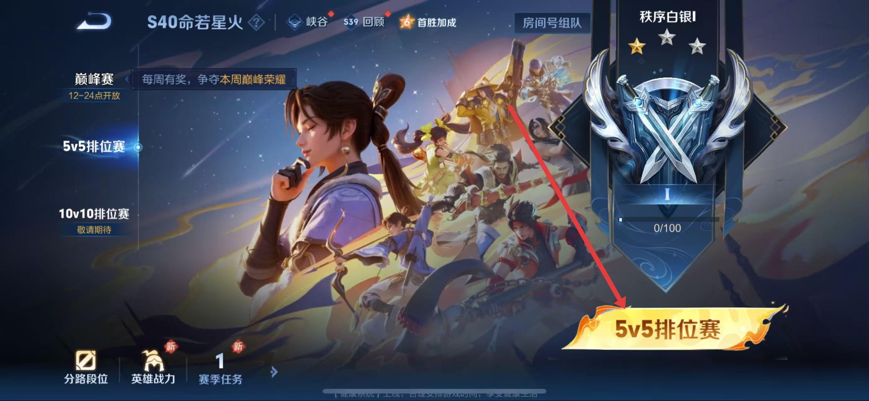 2、在排位賽選擇界面中,點擊5v5排位賽選項,系統(tǒng)將為你匹配隊友和對手,等待進入游戲加載界面。