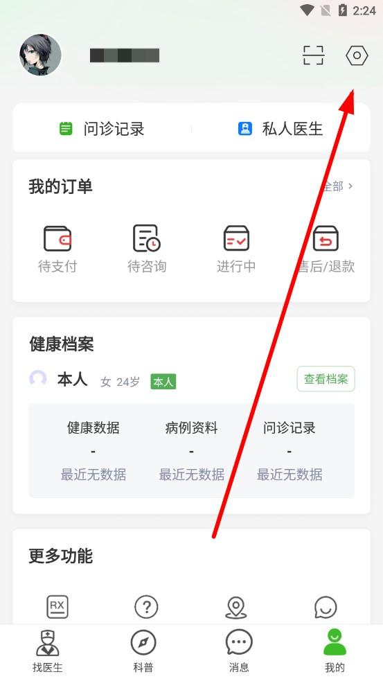 1、打開快速問醫(yī)生APP,點(diǎn)擊我的,進(jìn)入個(gè)人頁面,點(diǎn)擊右上角的設(shè)置圖標(biāo)。