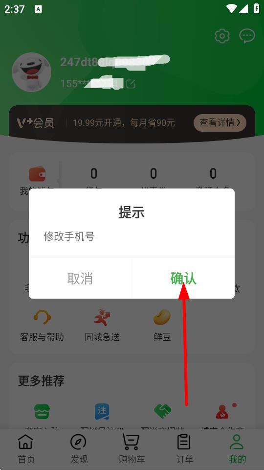 3、在彈出的提示框中,點(diǎn)擊確認(rèn)選擇修改手機(jī)號(hào)。