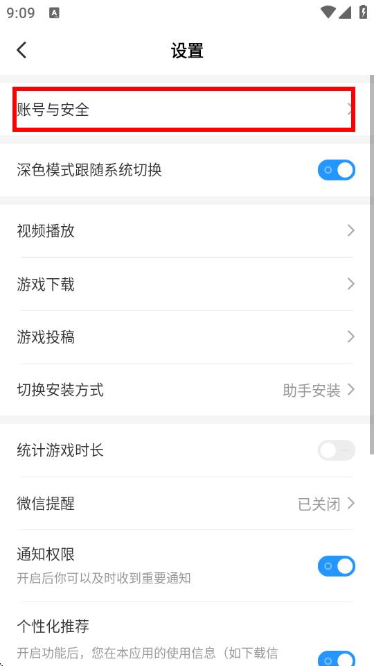 2、在設(shè)置界面中,點(diǎn)擊賬號(hào)與安全進(jìn)入賬號(hào)與安全設(shè)置頁。