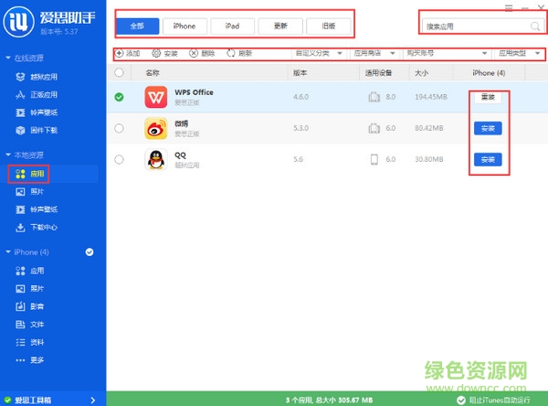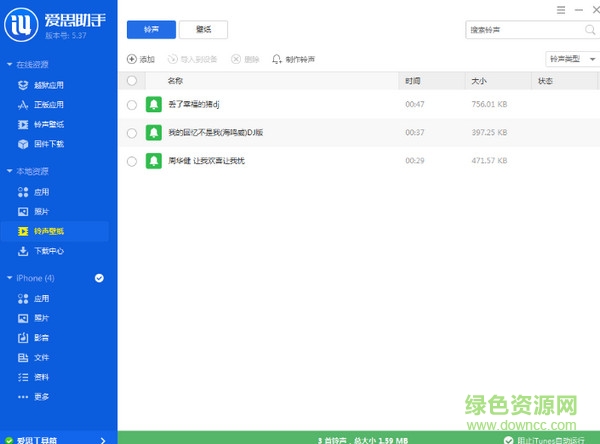 1、首先在本站下載愛思助手軟件后,然后安裝到電腦上,打開進入軟件主界面,如下圖所示,在界面左側(cè)有在線資源、本地資源兩類,在線資源指的是你可以通過該軟件獲取網(wǎng)絡(luò)上的正版應(yīng)用、鈴聲壁紙等。