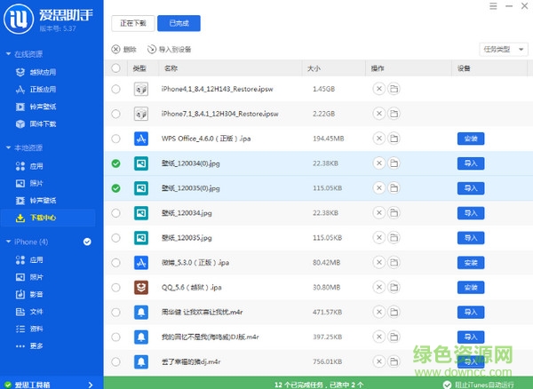 5、最后我們再點擊下載中心選項,然后在界面右側(cè)可以看到有正在下載和已完成的選項,正在下載中心中顯示的是正在下載中的軟件應(yīng)用,你可以停止下載、刪除等。在已完成中是已經(jīng)下載完成的應(yīng)用,同樣你也可以進行刪除、安裝,也可以導(dǎo)入到你的手機中。