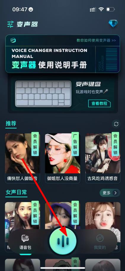 1、打開(kāi)變聲器APP后,點(diǎn)擊頁(yè)面下方中間的功能按鈕,彈出功能選擇界面。