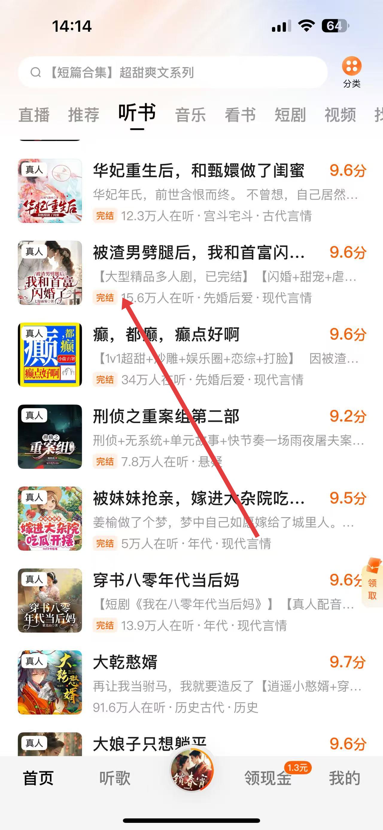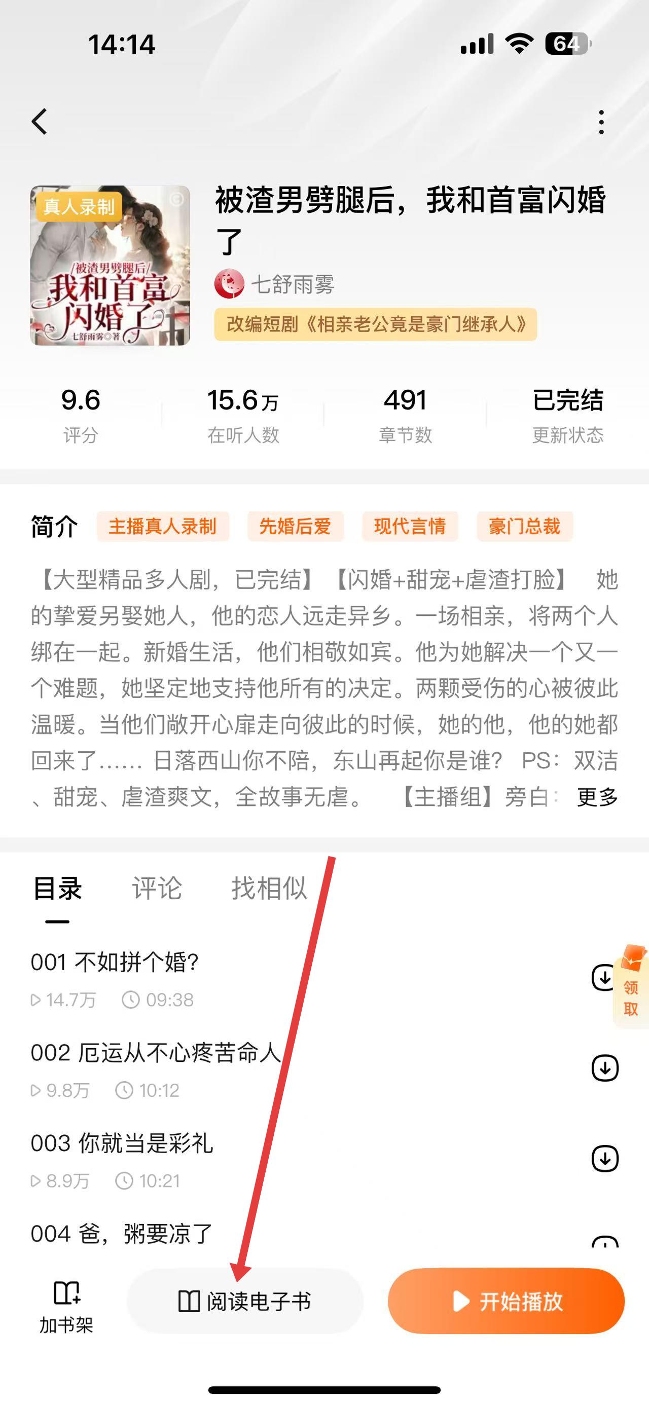 1、打開(kāi)酷我暢聽(tīng)APP,點(diǎn)擊下方導(dǎo)航欄中的聽(tīng)書(shū),進(jìn)入聽(tīng)書(shū)界面后,選擇想閱讀的書(shū)籍,比如被渣男劈腿后,我和首富閃婚了。