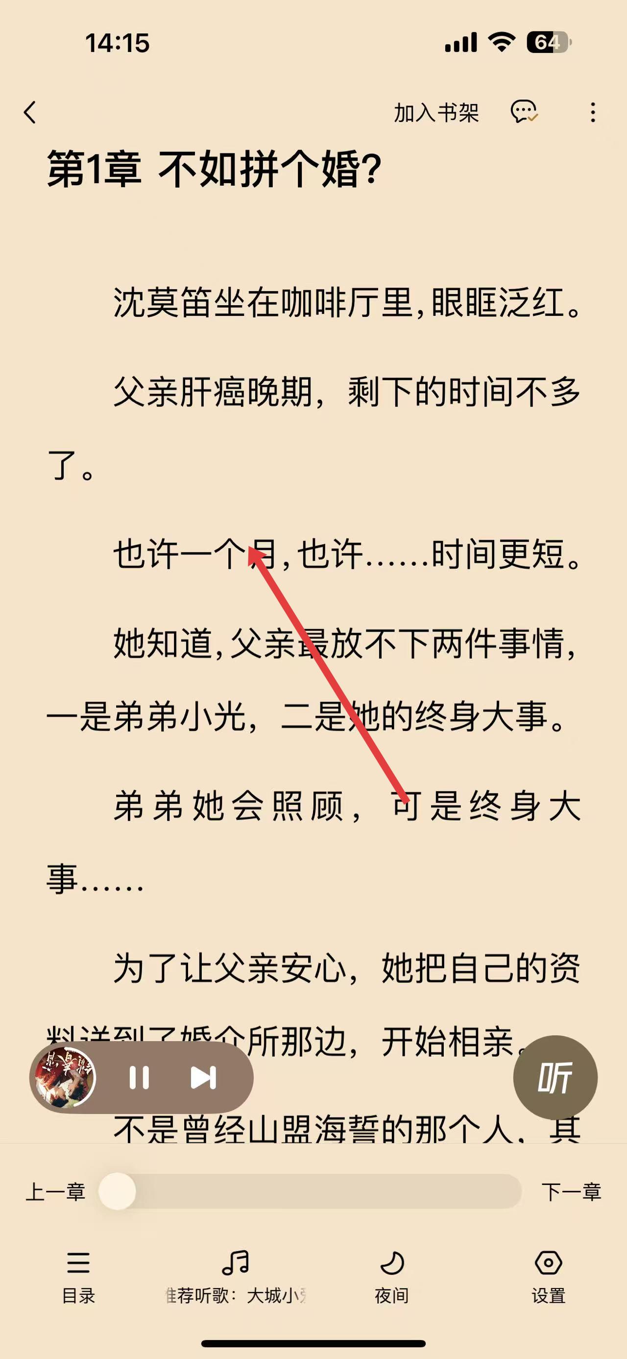 3、點(diǎn)擊后就會(huì)進(jìn)入書(shū)籍的文字閱讀界面,你可以通過(guò)上下滑動(dòng)屏幕來(lái)查看不同章節(jié)內(nèi)容,還能使用底部的目錄、設(shè)置等功能輔助閱讀。