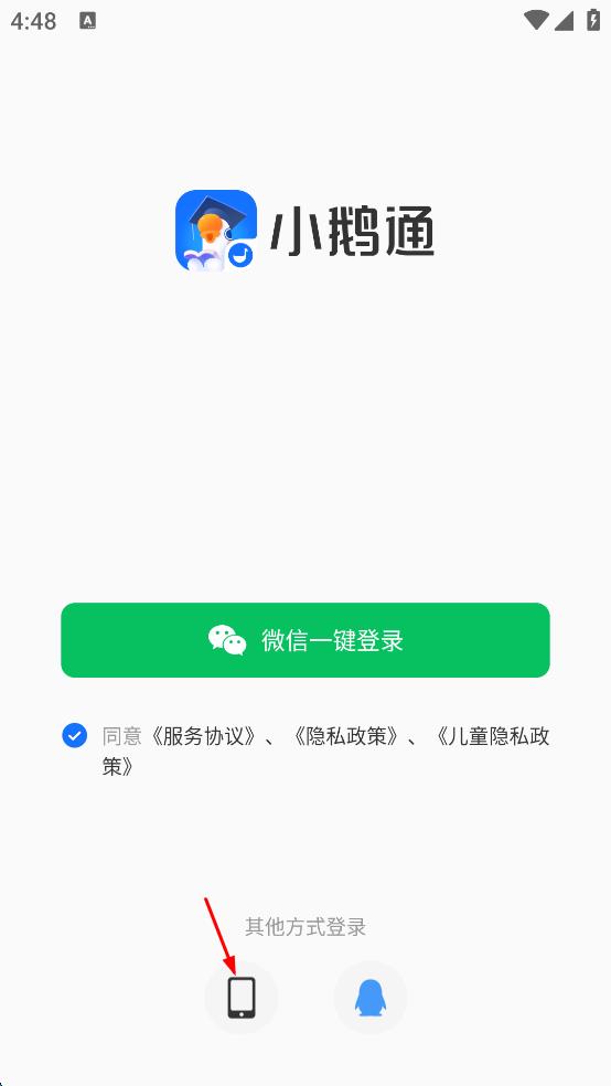 1、打開小鵝通軟件,進入登錄頁面,點擊頁面下方的手機圖標,進入登錄方式選擇頁面。
