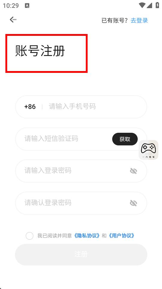 3、進入賬號注冊頁面,輸入手機號碼并點擊獲取短信驗證碼,輸入收到的驗證碼,設置登錄密碼并確認密碼,勾選同意。