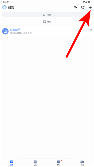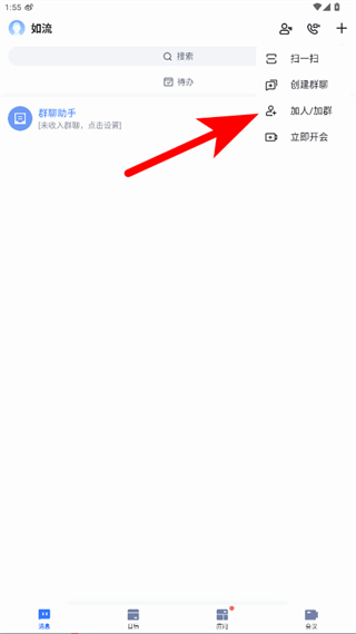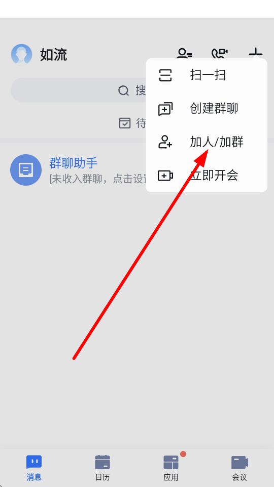 1、打開如流APP,在消息頁面點(diǎn)擊右上角加號,彈出功能菜單。