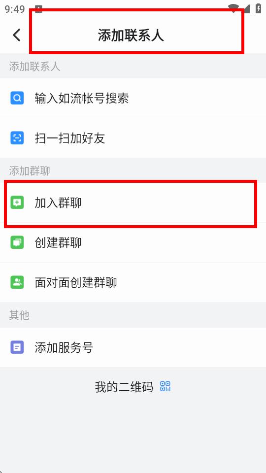 3、在添加聯(lián)系人頁面的添加群聊板塊中選擇加入群聊,進(jìn)入添加群聊頁面。