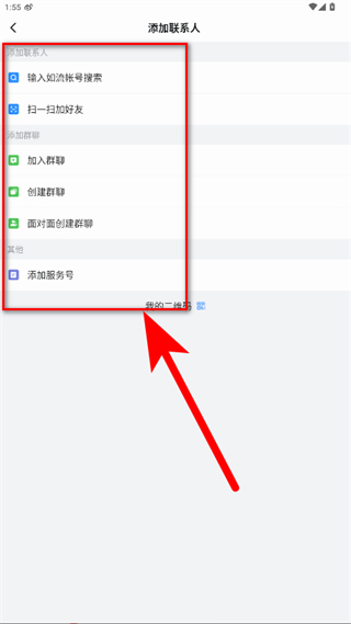 2、在功能菜單中點(diǎn)擊加人/加群,進(jìn)入添加聯(lián)系人頁面。