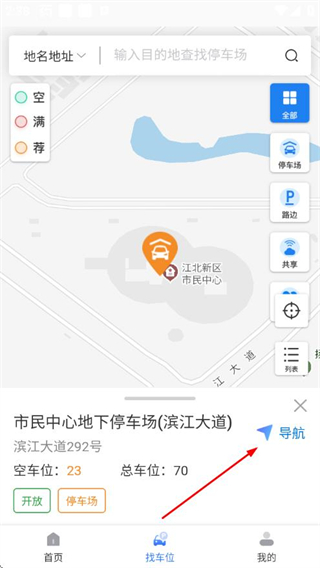3、點(diǎn)擊停車場(chǎng)標(biāo)識(shí)后,可查看該停車場(chǎng)的空車位等信息,點(diǎn)擊“導(dǎo)航”即可前往該停車點(diǎn)。