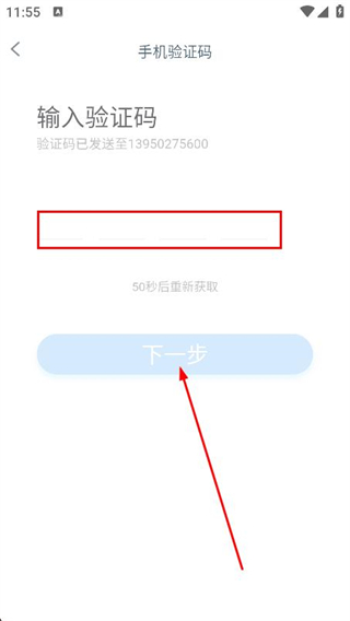 3、在手機驗證碼頁面,輸入收到的驗證碼,點擊下一步。