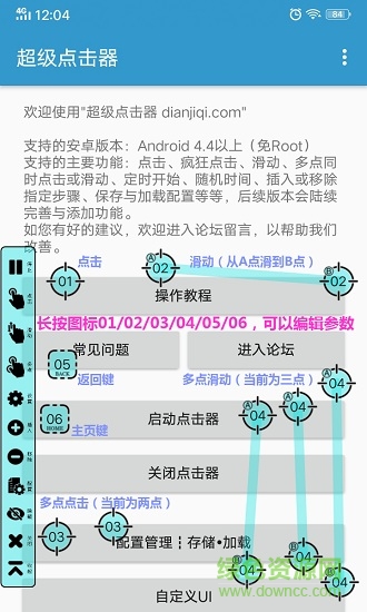 超級點擊器可以幫你徹底解放雙手,輕輕松松實現(xiàn)屏幕自動點擊!支持功能:點擊、瘋狂點擊、滑動、多點同時點擊或滑動、定時開始、隨機時間、插入或移除指定步驟、保存與加載配置等等,后續(xù)版本會陸續(xù)完善與添加功能!