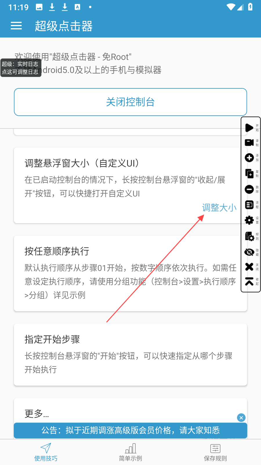 1、調整懸浮窗大小方面,在啟動控制臺后,若覺得控制臺懸浮窗大小不合適,點擊界面中調整大小字樣,即可快捷打開自定義UI,按照自身需求對懸浮窗進行放大或縮小操作。