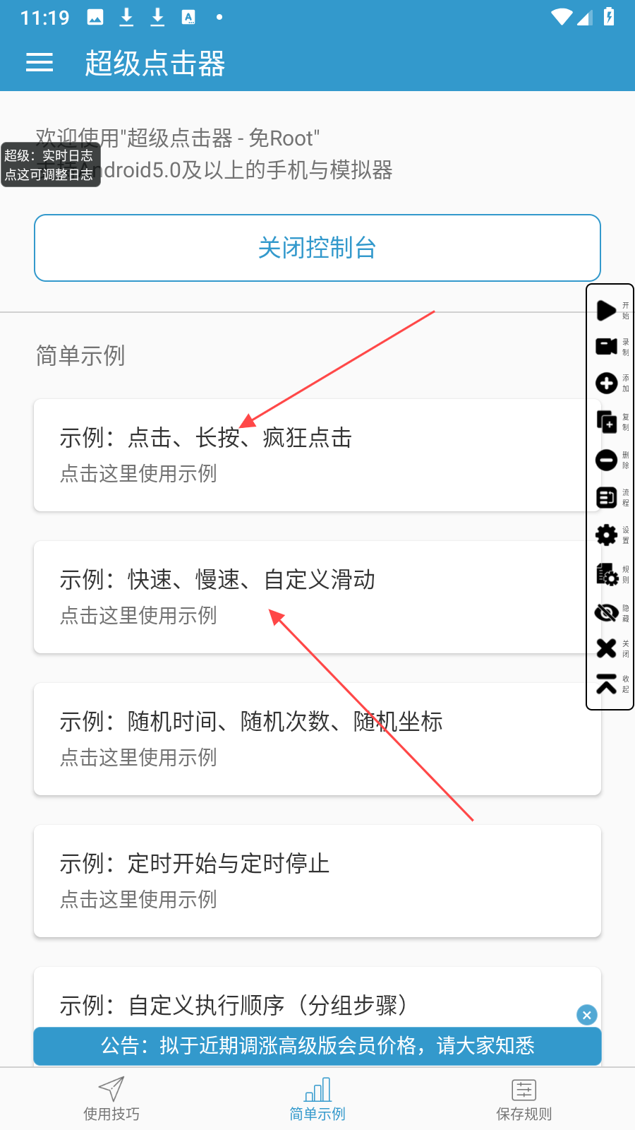 2、在獲取操作示例時,點擊簡單示例板塊,里面有點擊、長按、瘋狂點擊,快速、慢速、自定義滑動等多種示例,點擊對應示例下方的點擊這里使用示例,就能快速應用示例設置。