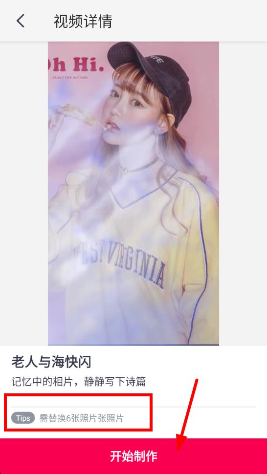 3、進(jìn)入所選視頻模板的詳情頁,了解如需替換6張照片等要求后,點(diǎn)擊開始制作按鈕,按提示操作即可拍攝制作趣動(dòng)視頻。