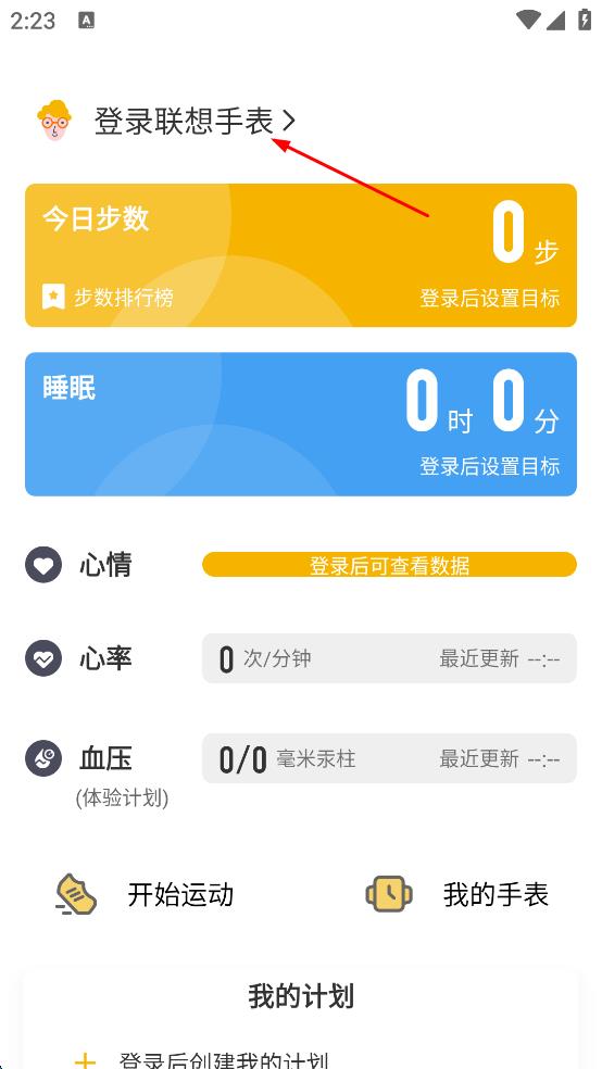 1、打開聯(lián)想手表APP,點(diǎn)擊頁面上方“登錄聯(lián)想手表”選項(xiàng),進(jìn)入登錄界面。