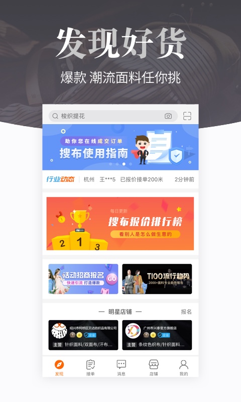 搜布是寧波搜布信息科技有限公司為面料從業(yè)者打造的一款手機(jī)app,專門為面料采購商與面料供應(yīng)商打造的信息交流平臺。免去了跑市場找布的麻煩,使用它你就可以隨時隨地手機(jī)找布省時、省力、省錢,解決了傳統(tǒng)交易難題,歡迎下載使用。